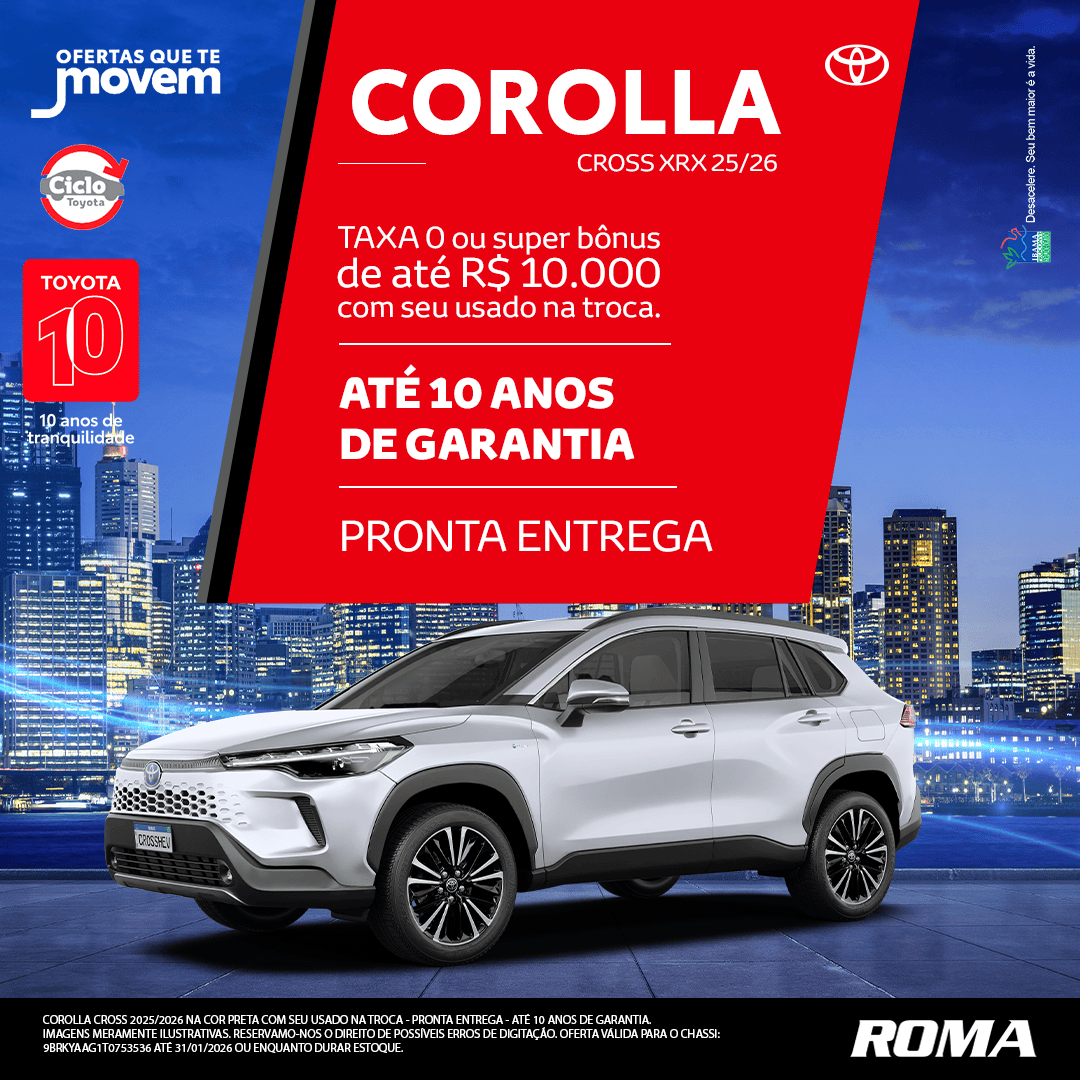 COROLLA CROSS 2025/2026 NA COR PRETA COM SEU USADO NA TROCA - PRONTA ENTREGA - ATÉ 10 ANOS DE GARANTIA .IMAGENS MERAMENTE ILUSTRATIVAS. RESERVAMO-NOS O DIREITO DE POSSÍVEIS ERROS DE DIGITAÇÃO. OFERTA VÁLIDA PARA O CHASSI: 9BRKYAAG1T0753536 ATÉ 31/01/2026 OU ENQUANTO DURAR ESTOQUE.